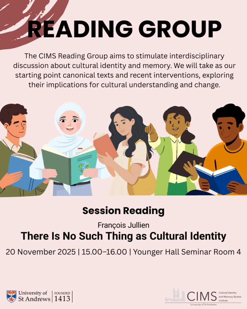 The CIMS Reading Group aims to stimulate interdisciplinary discussion about the importance of cultural identity and memory in society. We will take as our starting point for the sessions some canonical texts, as well as more recent interventions, and will explore these works and their implications for cultural understanding and change.